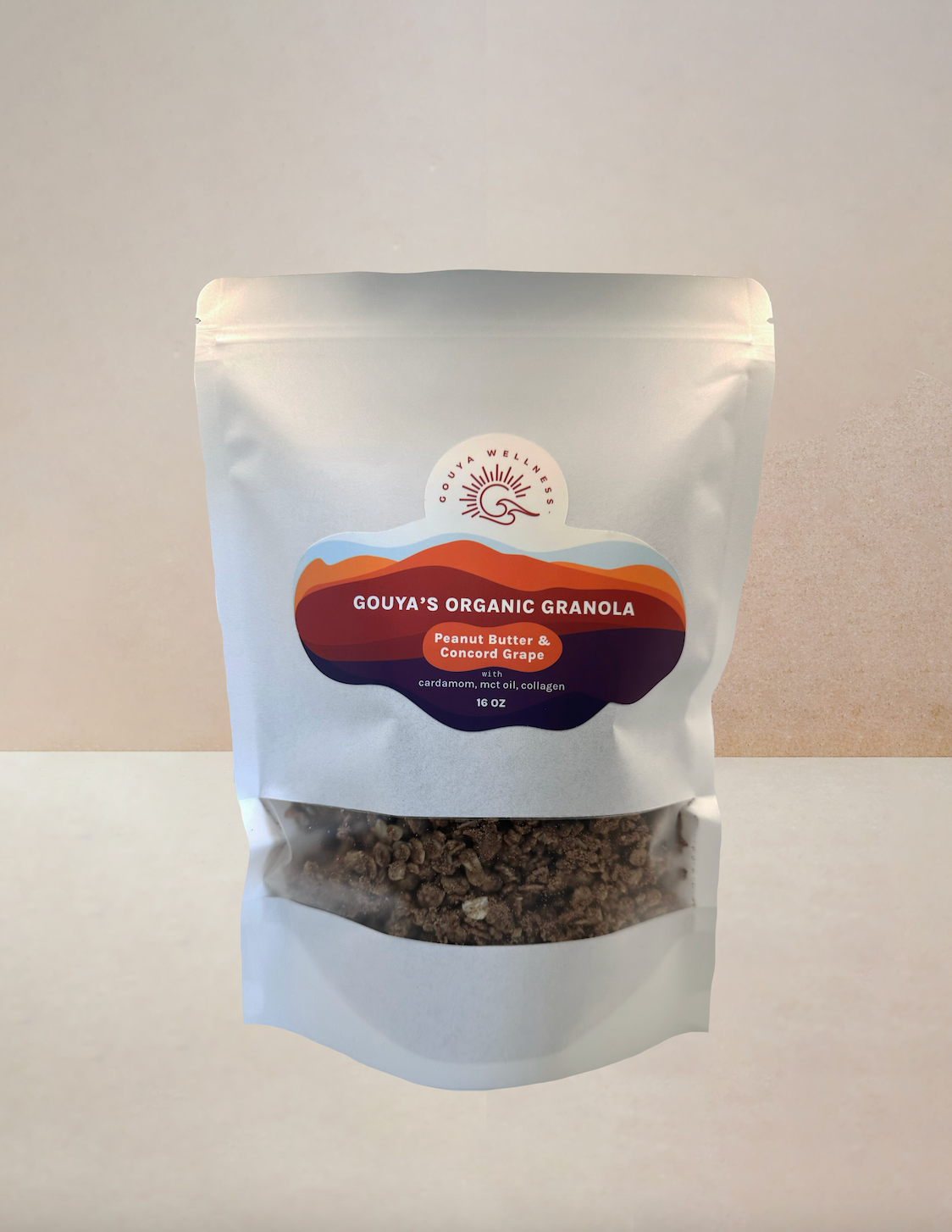 The Finest Ingredients: At Gouya, we believe that the foundation of a delicious granola lies in the quality of its ingredients. That's why we meticulously select the finest organic rolled oats, ensuring a hearty and wholesome base for your breakfast indulgence. Protein-packed peanut butter adds a delightful nutty twist, while the luscious sweetness of organic concord grape juice concentrate and organic cane sugar complement the blend perfectly. Gouya Granola goes beyond mere taste; it's a reflection of a mindful approach to nourishing your body and soul. We infuse our granola with collagen, promoting not only a healthy body but also a glowing complexion. The aromatic presence of cardamom infuses your mornings with warmth and tranquility, while ashwagandha helps to ground your senses and set a positive tone for the day ahead.